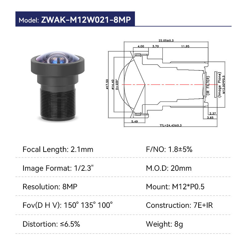 Lente M12 fixa de 1,1 mm F2,0 12 MP com campo de visão de 200° para formato de imagem 1/2,3"