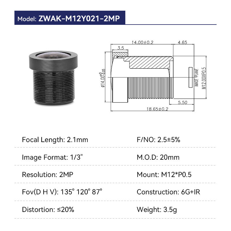 Lente M12 1,1 mm F2,2 de Foco Fixo 5MP Campo de Visão 190° para Formato de Imagem 1/3"
