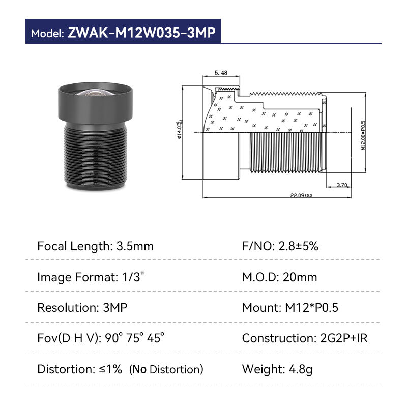 Lente M12 1,1 mm F2,2 de Foco Fixo 5MP Campo de Visão 190° para Formato de Imagem 1/3"