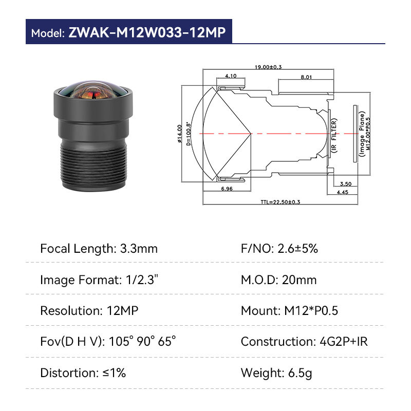 Lente M12 fixa de 1,1 mm F2,0 12 MP com campo de visão de 200° para formato de imagem 1/2,3"