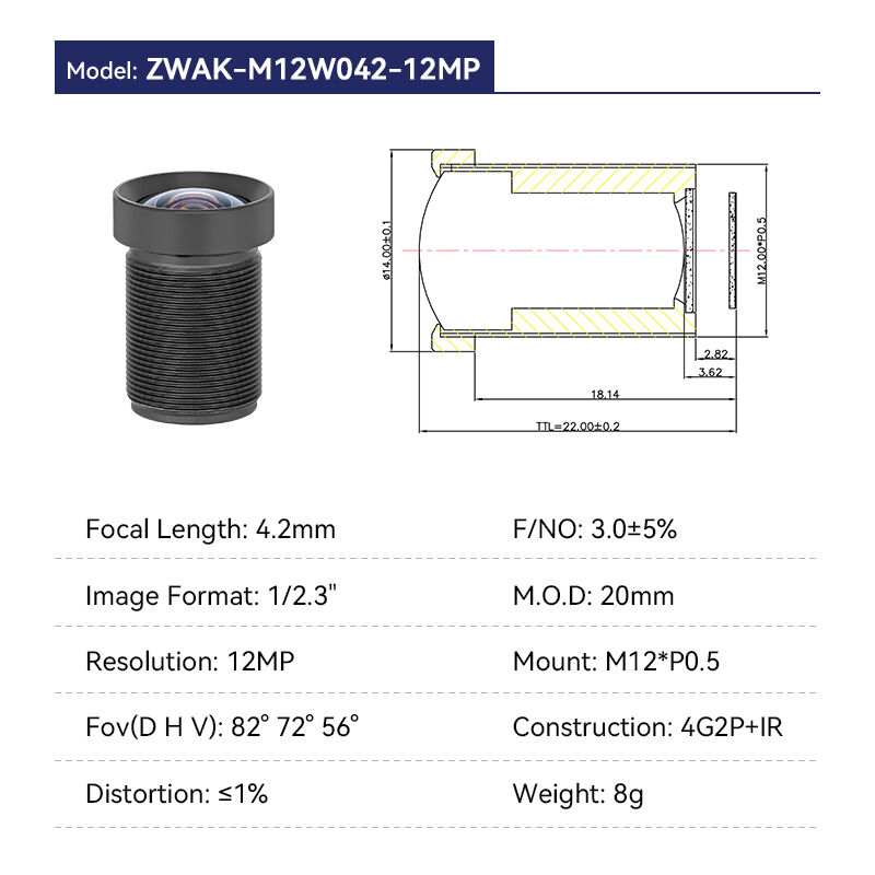 Lente M12 fixa de 1,1 mm F2,0 12 MP com campo de visão de 200° para formato de imagem 1/2,3"