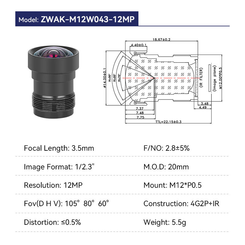 Lente M12 fixa de 1,1 mm F2,0 12 MP com campo de visão de 200° para formato de imagem 1/2,3"